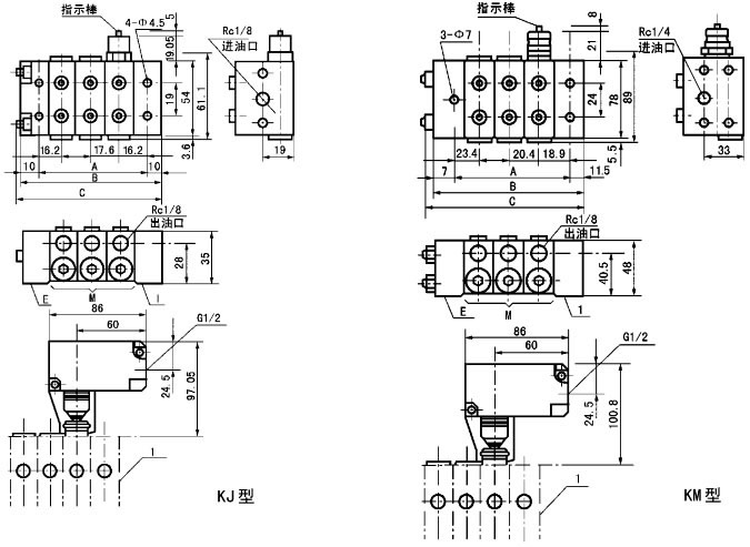 KJ、KM、KL系列单线递进式分配器,它由中碳合金结构钢制造的供给体、端部体和3~8片根据设计需要所确定的给油量和出油口数的中间体组合而成。分配器的正常出口设置于分配器的两侧面,在上面还设置有预备出口,各中间体的出油口内均装有止回阀,能彻底防止因润滑点背压作用而产生润滑脂的逆流,保证了各出油口的给油量定量、准确。