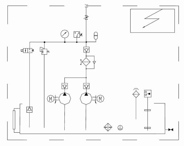 正常工作时,一台高压油泵常开工作,另一台备用,可通过电气转换开关来交替使用,并可通过按钮开关人工启动和停止油泵,PLC电气控制箱对油气系统实行程序化全自动控制,还可向主控室提供系统“运行”、“停止”、“故障”等远程信号接口。